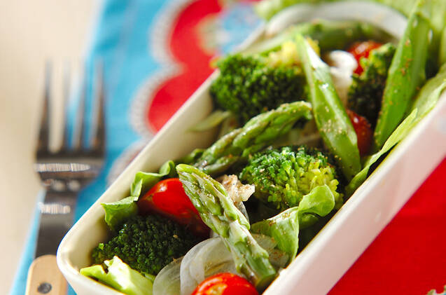 ゆで野菜の和風サラダのレシピ 作り方 味の素パーク の料理 レシピサイト レシピ大百科 グリーンアスパラガスやミニトマトを使った料理